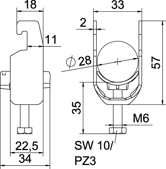Product descriptionClamp clip with U-foot, plastic pressure sleeve made of polypropylene. For vertical and horizontal mounting of 1 single cable on a C-profile rail. For slot width 18–22 mm. With 1-start screw thread on pressure sleeve, universal hexagonal screw head WAF10, with slot and cross recess. Suitable for assembly indoors and outdoors. We recommend the use of a counter-sleeve.