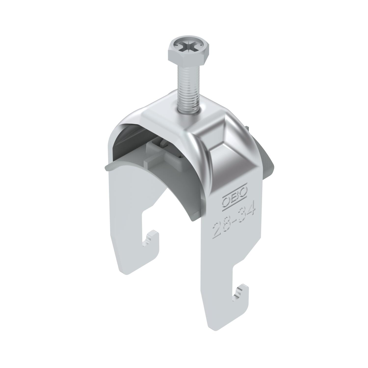 Product descriptionClamp clip with U-foot, plastic pressure sleeve made of polypropylene. For vertical and horizontal mounting of 1 single cable on a C-profile rail. For slot width 18–22 mm. With 1-start screw thread on pressure sleeve, universal hexagonal screw head WAF10, with slot and cross recess. Suitable for assembly indoors and outdoors. We recommend the use of a counter-sleeve.