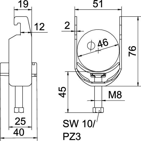 Clamping range D, max. 46 mm Clamping range D, min. 40 mm CO2 Footprint (GWP) Cradle-to-Gate 0,2026 kg CO2e / 1 Piece Dimension 40-46mm Dimension A 25 mm Dimension B 51 mm Dimension C 40 mm Dimension G (mm) M8 Dimension H 76 mm Dimension L 45 mm Dimension t 2 mm For pipe diameter, max. 46 mm For pipe diameter, min. 40 mm for rail with slot width (with interval), max. 22 mm for rail with slot width (with interval), min. 18 mm Halogen-free yes Height 76 mm Length 25 mm Length of external dimensions 40 mm Material Steel Material addition Steel Material of trough Plastic Material quality of trough Polypropylene Max. Tightening torque 5 Nm Mounting type Profile rail Number of cables/pipes 1 Plate thickness 2 mm Slot width 10 mm Surface Hot-dip galvanised Surface addition hot galvanised Thread M8 Width 51 mm With counter-trough no With plastic trough yes - All types