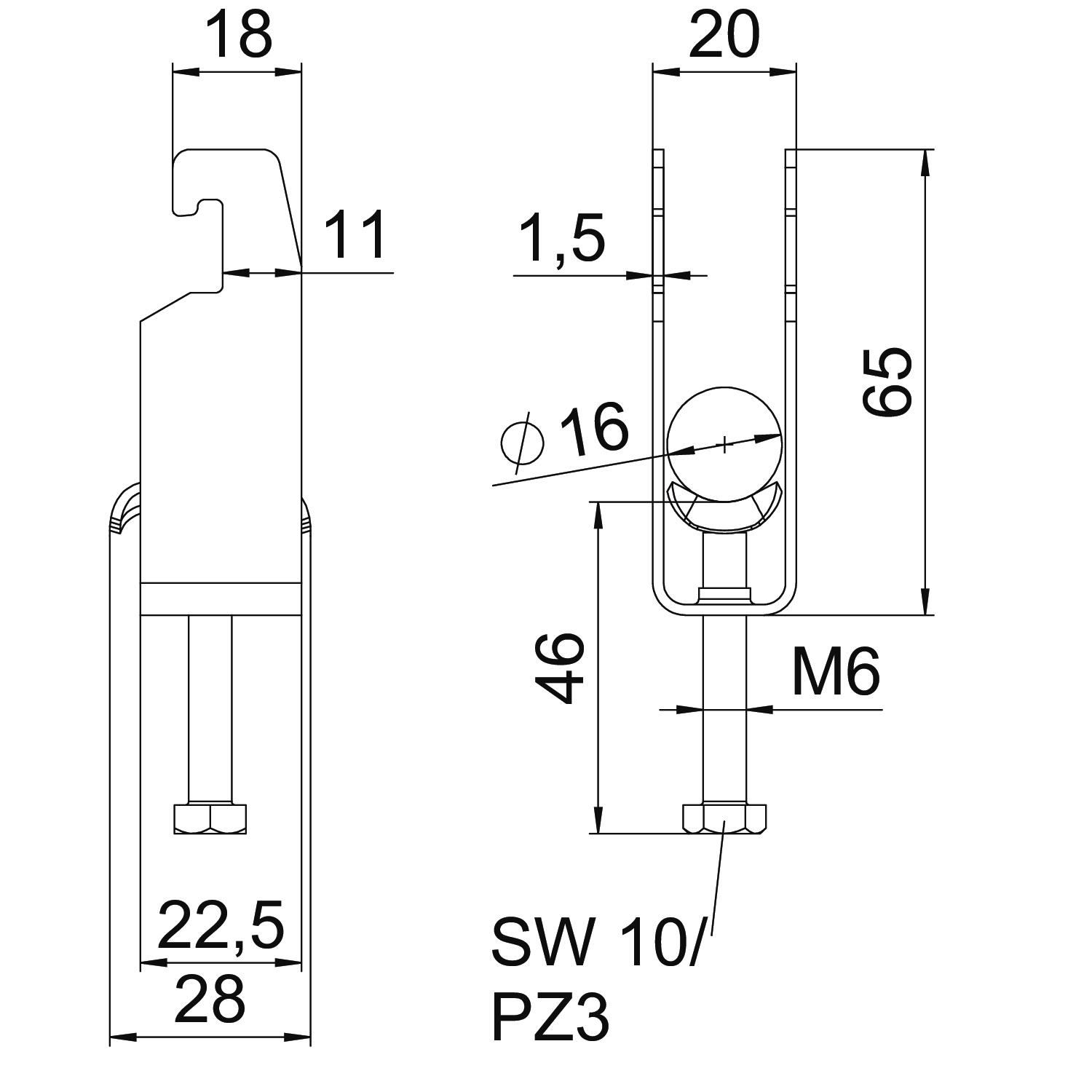 Clamping range D, max. 16 mm Clamping range D, min. 12 mm CO2 Footprint (GWP) Cradle-to-Gate 0,1435 kg CO2e / 1 Piece Dimension 12-16mm Dimension A 22,5 mm Dimension B 20 mm Dimension C 28 mm Dimension G (mm) M6 Dimension H 65 mm Dimension L 46 mm Dimension t 1,5 mm For pipe diameter, max. 16 mm For pipe diameter, min. 12 mm for rail with slot width (with interval), max. 22 mm for rail with slot width (with interval), min. 18 mm Halogen-free yes Height 65 mm Length 22,5 mm Length of external dimensions 28 mm Maintain electrical functions yes Material Steel Material addition Steel Material of trough Steel Max. Tightening torque 3 Nm Mounting type Profile rail Number of cables/pipes 2 Plate thickness 1,5 mm Slot width 10 mm Surface Hot-dip galvanised Surface addition hot galvanised Thread M6 Width 20 mm With counter-trough no With metal trough yes With plastic trough no - All types