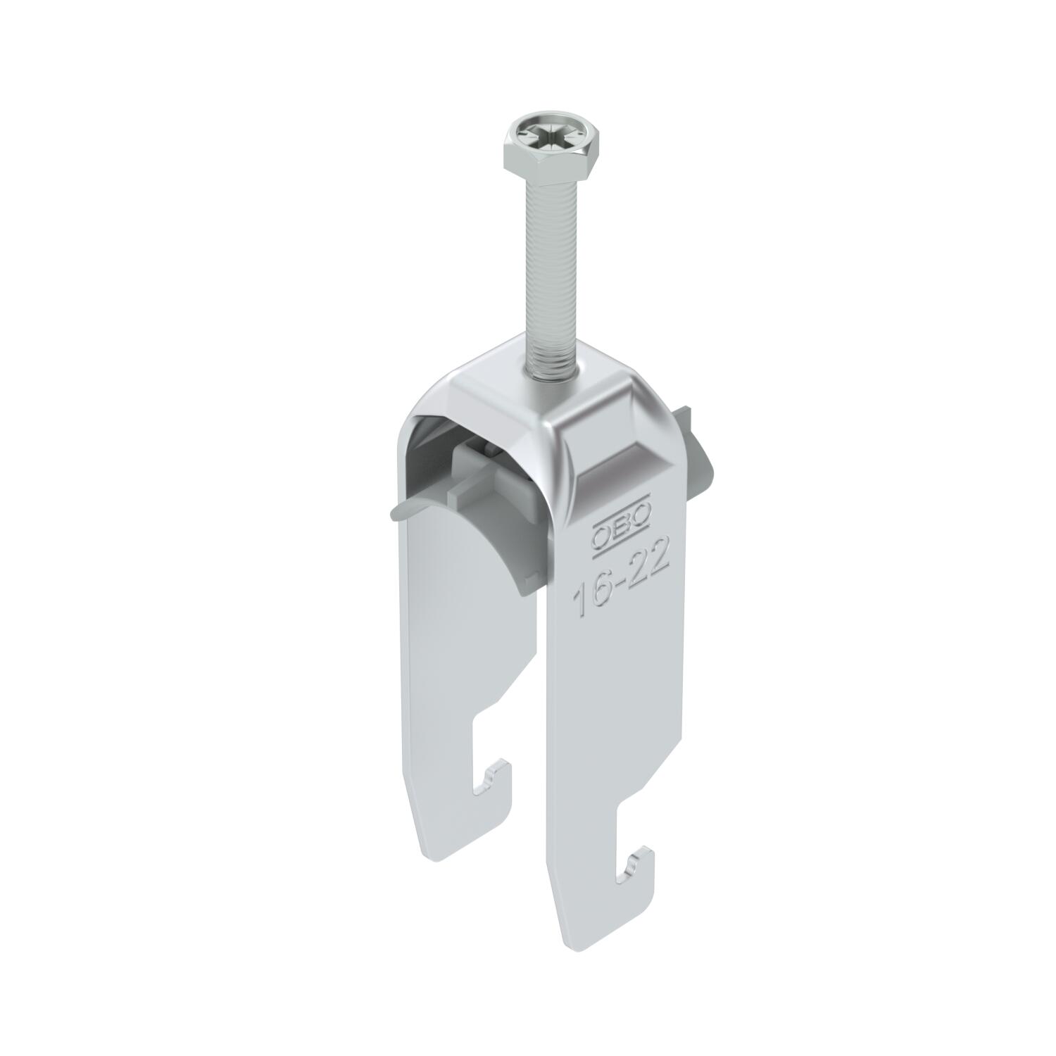 Product descriptionClamp clip with U-foot, plastic pressure sleeve made of polypropylene. For vertical and horizontal mounting of 2 single cables on a C-profile rail. For slot width 18–22 mm. With 1-start screw thread on pressure sleeve, universal hexagonal screw head WAF10, with slot and cross recess. Suitable for assembly indoors and outdoors. Multiple cables should be separated by double sleeves. We recommend the use of a counter-sleeve.