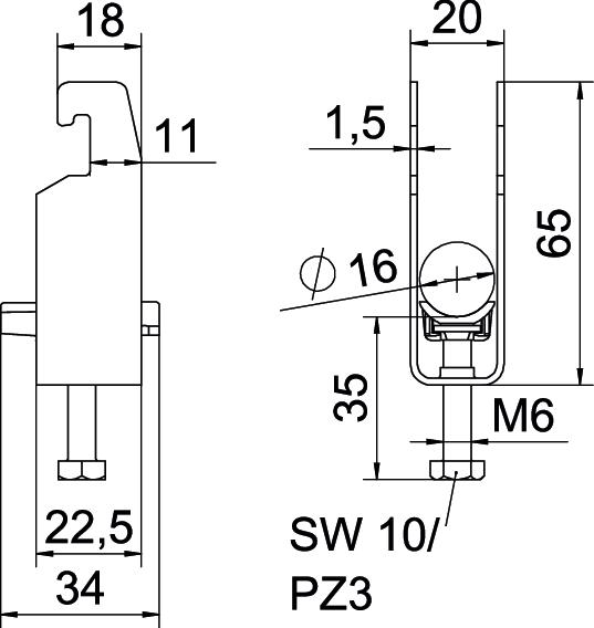 Clamping range D, max. 16 mm Clamping range D, min. 12 mm CO2 Footprint (GWP) Cradle-to-Gate 0,1396 kg CO2e / 1 Piece Dimension 12-16mm Dimension A 22,5 mm Dimension B 20 mm Dimension C 34 mm Dimension G (mm) M6 Dimension H 65 mm Dimension L 47 mm Dimension t 1,5 mm For pipe diameter, max. 16 mm For pipe diameter, min. 12 mm for rail with slot width (with interval), max. 22 mm for rail with slot width (with interval), min. 18 mm Halogen-free yes Height 65 mm Length 22,5 mm Length of external dimensions 34 mm Material Steel Material addition Steel Material of trough Plastic Material quality of trough Polypropylene Max. Tightening torque 3 Nm Mounting type Profile rail Number of cables/pipes 2 Plate thickness 1,5 mm Slot width 10 mm Surface Hot-dip galvanised Surface addition hot galvanised Thread M6 Width 20 mm With counter-trough no With plastic trough yes - All types