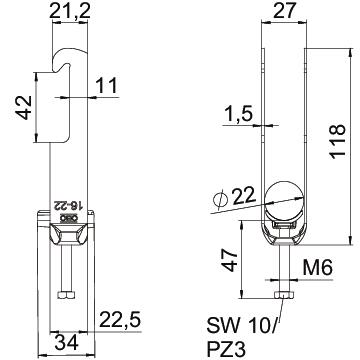 Clamping range D, max. 22 mm Clamping range D, min. 16 mm CO2 Footprint (GWP) Cradle-to-Gate 0,2332 kg CO2e / 1 Piece Dimension 16-22mm Dimension A 22,5 mm Dimension B 27 mm Dimension C 34 mm Dimension G (mm) M6 Dimension H 118 mm Dimension L 47 mm Dimension t 1,5 mm For pipe diameter, max. 22 mm For pipe diameter, min. 16 mm Halogen-free yes Height 118 mm Length 22,5 mm Length of external dimensions 34 mm Material Steel Material addition Steel Material of trough Plastic Material quality of trough Polypropylene Max. Tightening torque 3 Nm Mounting type Angle profile Number of cables/pipes 2 Plate thickness 1,5 mm Slot width 10 mm Surface Hot-dip galvanised Surface addition hot galvanised Thread M6 Width 27 mm With counter-trough no With plastic trough yes - All types