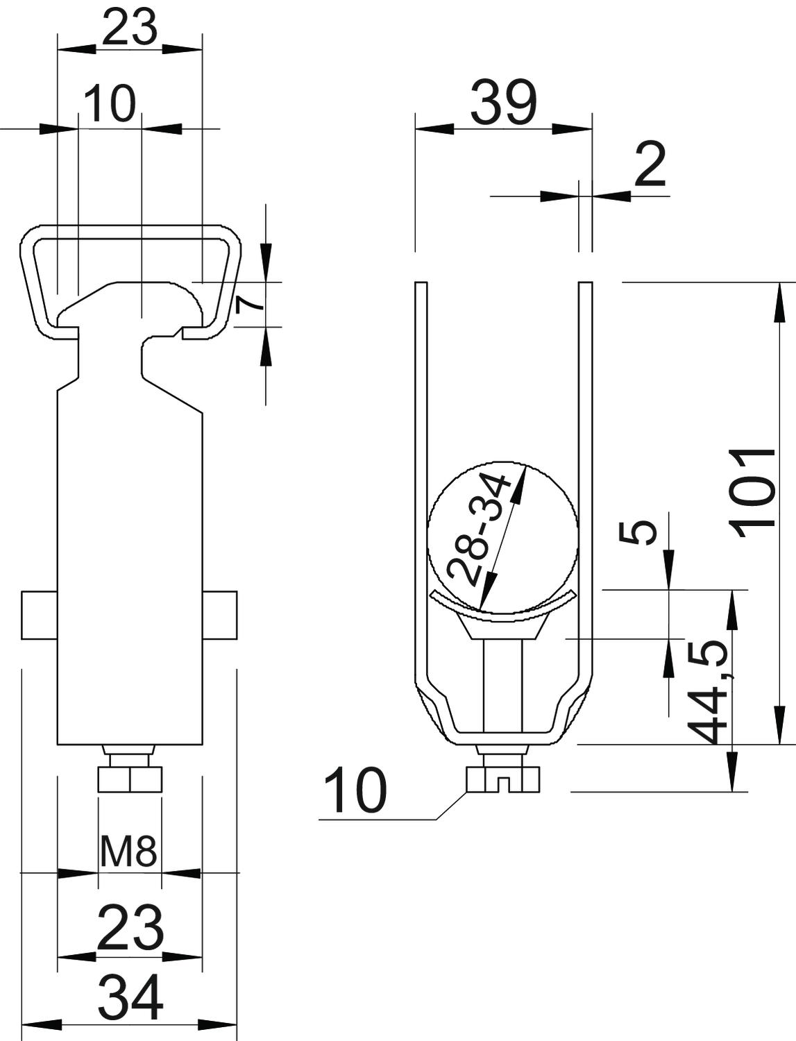 Clamping range D, max. 34 mm Clamping range D, min. 28 mm CO2 Footprint (GWP) Cradle-to-Gate 0,179 kg CO₂e / 1 Piece Dimension 28-34mm Dimension A 23 mm Dimension B 39 mm Dimension C 34 mm Dimension G (mm) M8 Dimension H 101 mm Dimension L 44,5 mm Dimension t 2 mm Dimension x 6 mm for rail with slot width (with interval), max. 17 mm for rail with slot width (with interval), min. 16 mm Halogen-free yes Impact-resistant no Material Steel Material addition Steel Material of trough Plastic Material quality of trough Polypropylene Max. Tightening torque 5 Nm Mounting type Profile rail Number of cables/pipes 2 Surface Hot-dip galvanised Surface addition hot galvanised With counter-trough no With plastic trough yes - All types