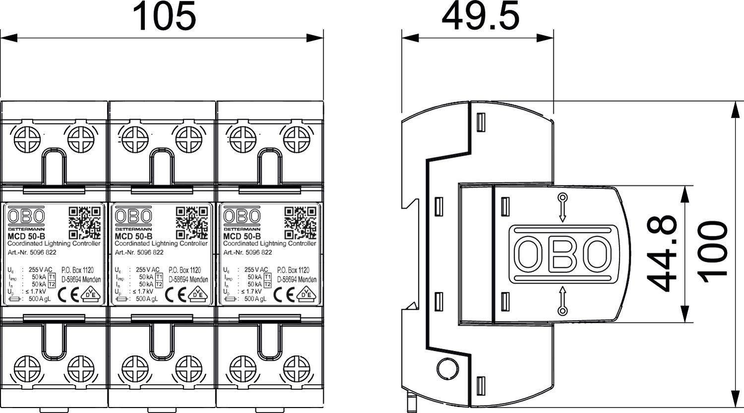 3x MCD 50-B: Type 1+2 (Class B) coordinated lightning current arrester EN 61643-11. For interface 0 to 2 (LPZ) in accordance with lightning protection zone concept to IEC 62305 and/or VDE 0185-305.