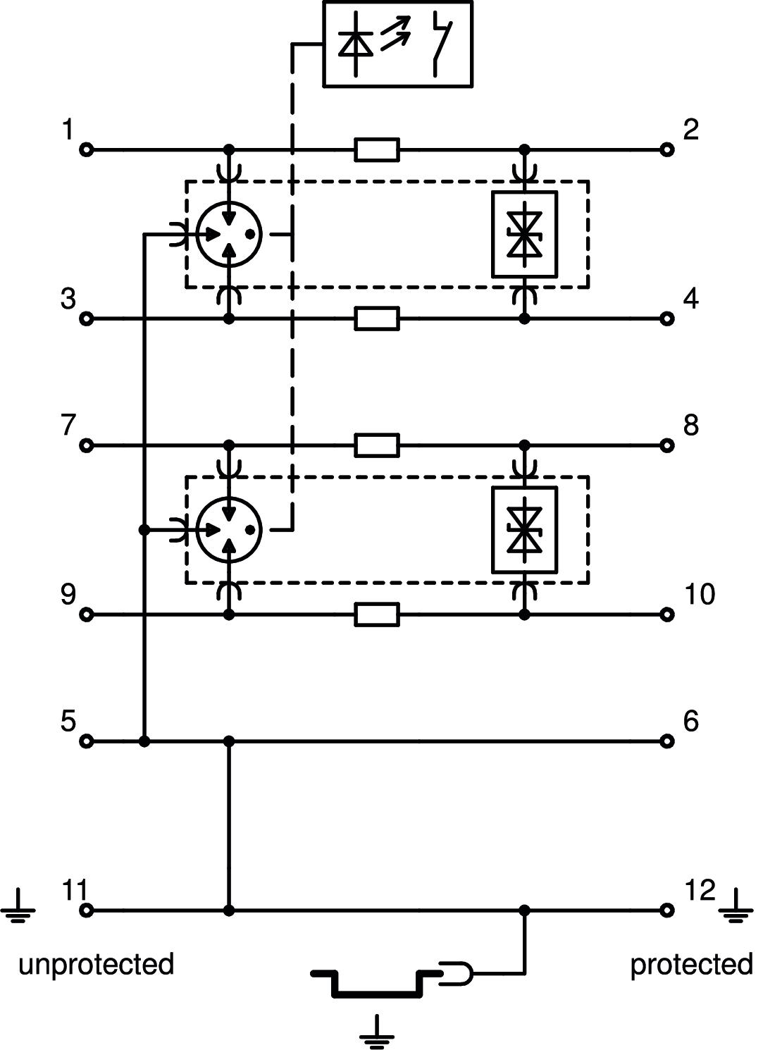 Capacity (wire-earth) ≤30 pF Capacity (wire-wire) ≤30 pF CO2 Footprint (GWP) Cradle-to-Gate 0,7765 kg CO2e / 1 Piece Connection cross-section, flexible, max. 1,5 mm² Connection cross-section, flexible, min. 0,14 mm² Connection cross-section, multi-wire, max. 2,5 mm² Connection cross-section, multi-wire, min. 0,14 mm² Connection cross-section, rigid, max. 2,5 mm² Connection cross-section, rigid, min. 0,14 mm² Cut-off frequency 100 MHz Dimension 12V Earthing via: Connection cable / DIN rail Height 95 mm Impulse durability wire-earth 10 kV / 5 kA Impulse durability wire-wire 10 kV / 5 kA Insertion loss ≤3 dB Kategorie Type 1+2 / D1+C2 Length 75 mm Lengthwise resistance 1.2 ± 5% Lightning impulse current 2,5 kA Lightning protection zone LPZ 0→2 Maximum continuous voltage AC 12 V Maximum continuous voltage DC 16 V Mounting of input / output Screw terminals Nominal discharge current (8/20 µs) 10 kA Nominal load current AC 0,425 A Nominal load current DC 0,6 A Number of poles 4 Permitted temperature range, max. 80 °C Permitted temperature range, min. -40 °C Plug-in system Terminal Protection level wire-earth 850 V Protection level wire-wire 130 V Protection rating IP20 Screening Direct Series resistance per wire 1,2 Ω ± 5% Shielding connection available yes Signalling on device None SPD to EN 61643-11 Type 1+2 SPD to IEC 61643-1 Class I+II SPD to IEC 61643-21 Class I+II / D1+C2 Testing standard IEC 61643-21 Total discharge current (10/350) 5 kA Total discharge current (8/20) 20 kA Total impulse durability into C2 (8/20) 20 kA Version for 2x2-pole Width 17,5 mm - All types