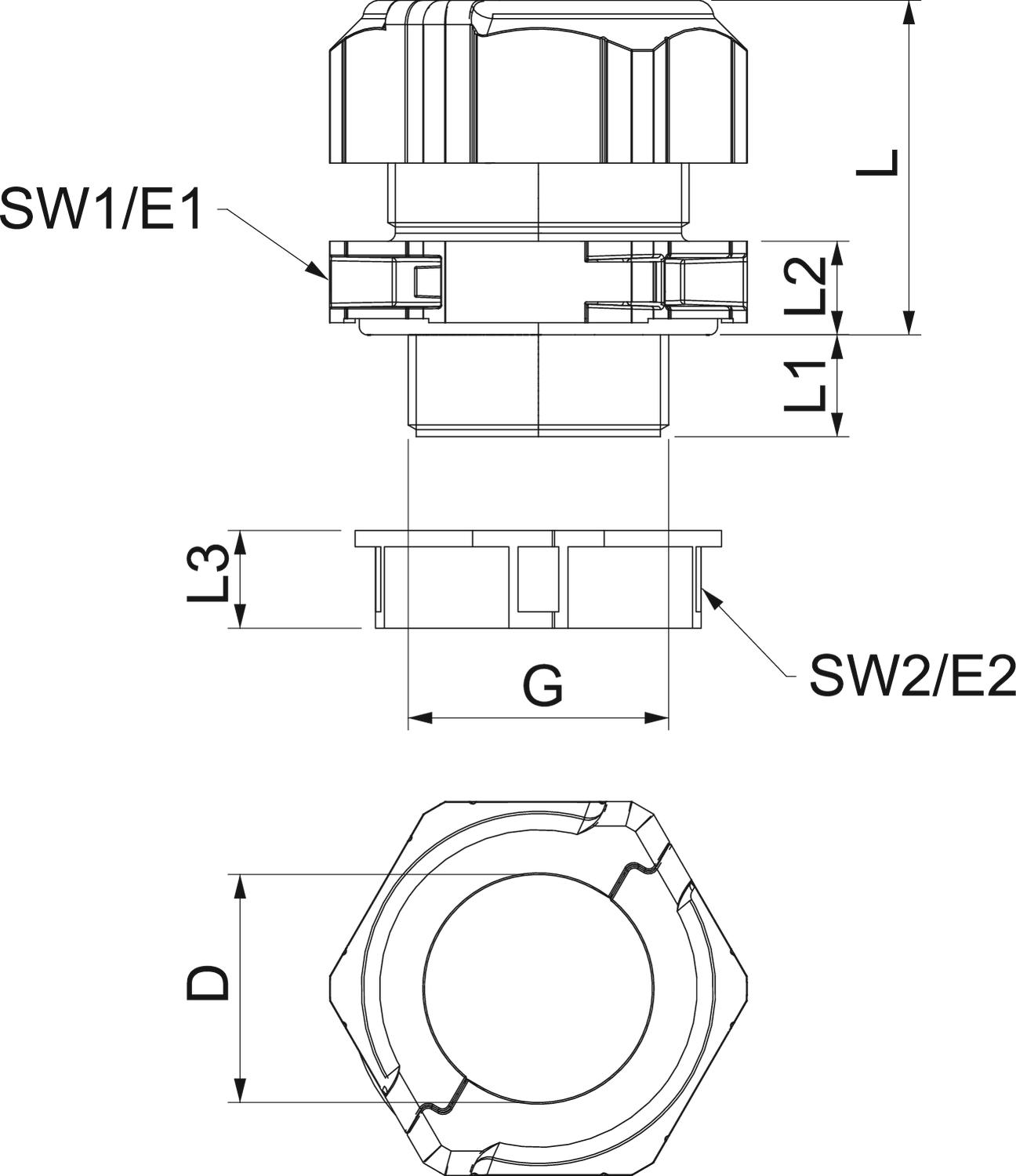 Bend protection no CO2 Footprint (GWP) Cradle-to-Gate 0,3431 kg CO2e / 1 Piece Colour Light grey Dimension M32 Dimension D 28 mm Dimension E 51,5 mm Dimension E1 (mm) 51,5 mm Dimension E2 45 mm Dimension G M32x1,5 mm Dimension L 41 mm Dimension L max. 41 mm Dimension L min. 32 mm Dimension L1 14 mm Dimension L2 10 mm Dimension L3 12 mm explosion-proof no Fibre-glass reinforced no Flame-resistant acc. to VDE 0471/DIN 695 Part 2-1, test temperature 650°C Flat cable gland no For Ex zone Without For Ex zone dust Without For Ex zone gas Without Halogen-free yes Height 53,5 mm Impact-resistant yes Length 46 mm Material Polycarbonate Nominal thread size 32 Permitted temperature range, max. 80 °C Permitted temperature range, min. -20 °C Protection rating IP67 Sealing insert, multiple no Splittable gland yes Strain relief option no Thread M32 x 1,5 Thread increase 1,5 mm Thread length 14 mm Thread type Metric Type of seal Sealing ring Unstable torque 8 Nm Version for Straight WAF 46 WAF 1 46 mm WAF 2 40 mm Width 51,5 mm With locknut yes - All types