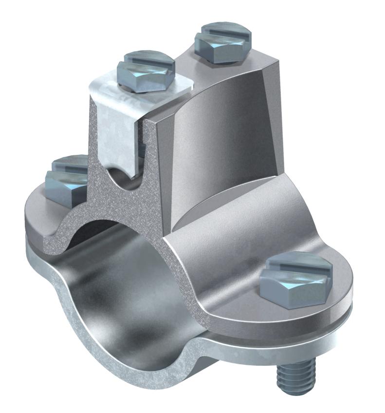 • Top section of clamp with cast contact point from die-cast zinc, bottom section of clamp from hot-dip galvanised steel