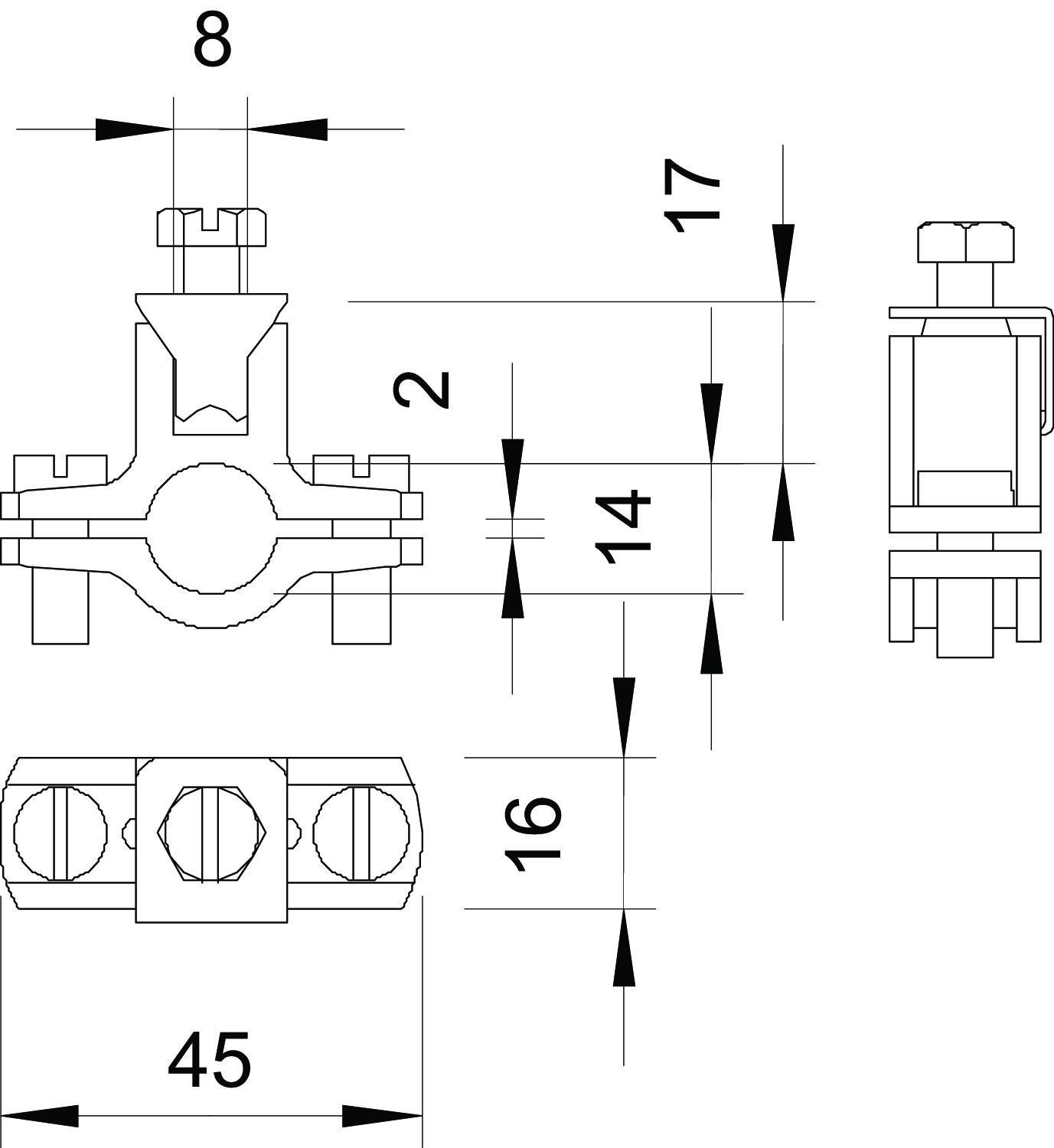Clamping range D 1/4 Clamping range D, max. 14 mm Clamping range D, min. 12 mm CO2 Footprint (GWP) Cradle-to-Gate 0,2201 kg CO2e / 1 Piece Cross-section of cable to be connected, max. 35 mm² Dimension 1/4" Dimension A 45 mm Dimension D 14 mm Dimension X 2 mm Material Die-cast zinc Number of conductors 1 Surface Electrogalvanized - All types