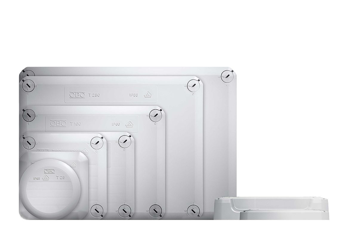 The individual characteristics of the models of the T series mean that they are not only junction boxes, but true all-rounders. For example, there is a condensation water opening on each side wall of the junction boxes, which can be pushed in easily as necessary. Also, on all sides of the junction box, there are alignment markings for alignment with a chalk line. Cleverly arrayed mounting points create versatile mounting options for the interior.