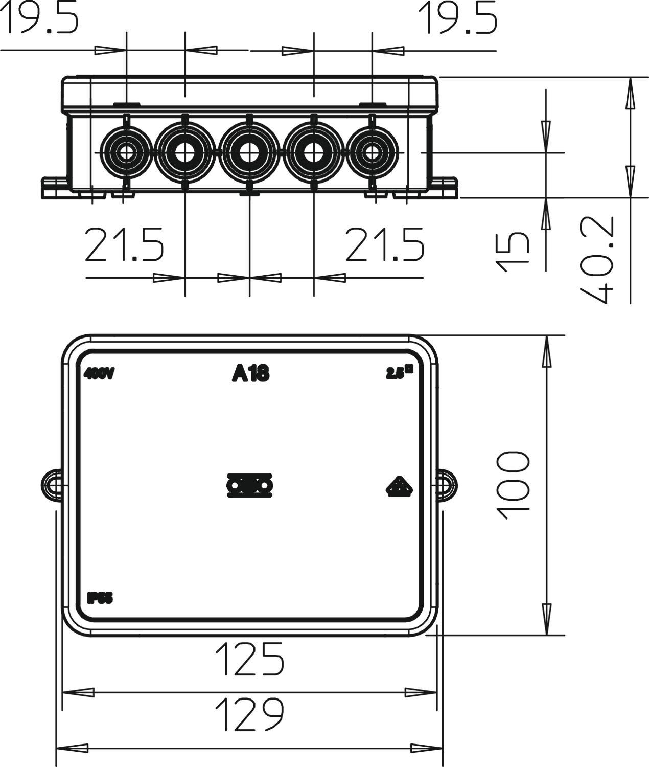 Clear internal dimensions 115x90x35 mm CO2 Footprint (GWP) Cradle-to-Gate 0,1968 kg CO2e / 1 Piece Colour Pure white; RAL 9010 Cover Not transparent Cover fastening Locking Dimension 125x100x38 Entry from rear no Equipment Without Expandable yes Explosion-tested version no Flame-resistant acc. to VDE 0471/DIN 695 Part 2-1, test temperature 650°C For Ex zone Without For Ex zone dust Without For Ex zone gas Without Halogen-free yes Height 40 mm Junction box cover version Blanking lid Length 125 mm Maintain electrical functions Without Material Polyethylene Max. Conductor cross-section 2,5 mm² Measured insulation voltage Vi 690 V Mounting type Wall/ceiling mounting No. of entries 18 Nominal cross-section, min. 2,5 mm² Nominal voltage 690 V Permitted temperature range, max. 45 °C Permitted temperature range, min. -5 °C Protection rating IP55 Sealable no Shape Square Transparent lid no Type of entry Cable Type of entry Cable Type of housing penetration Pre-marking Weatherproof no Width 100 mm with lid yes With screening no - All types