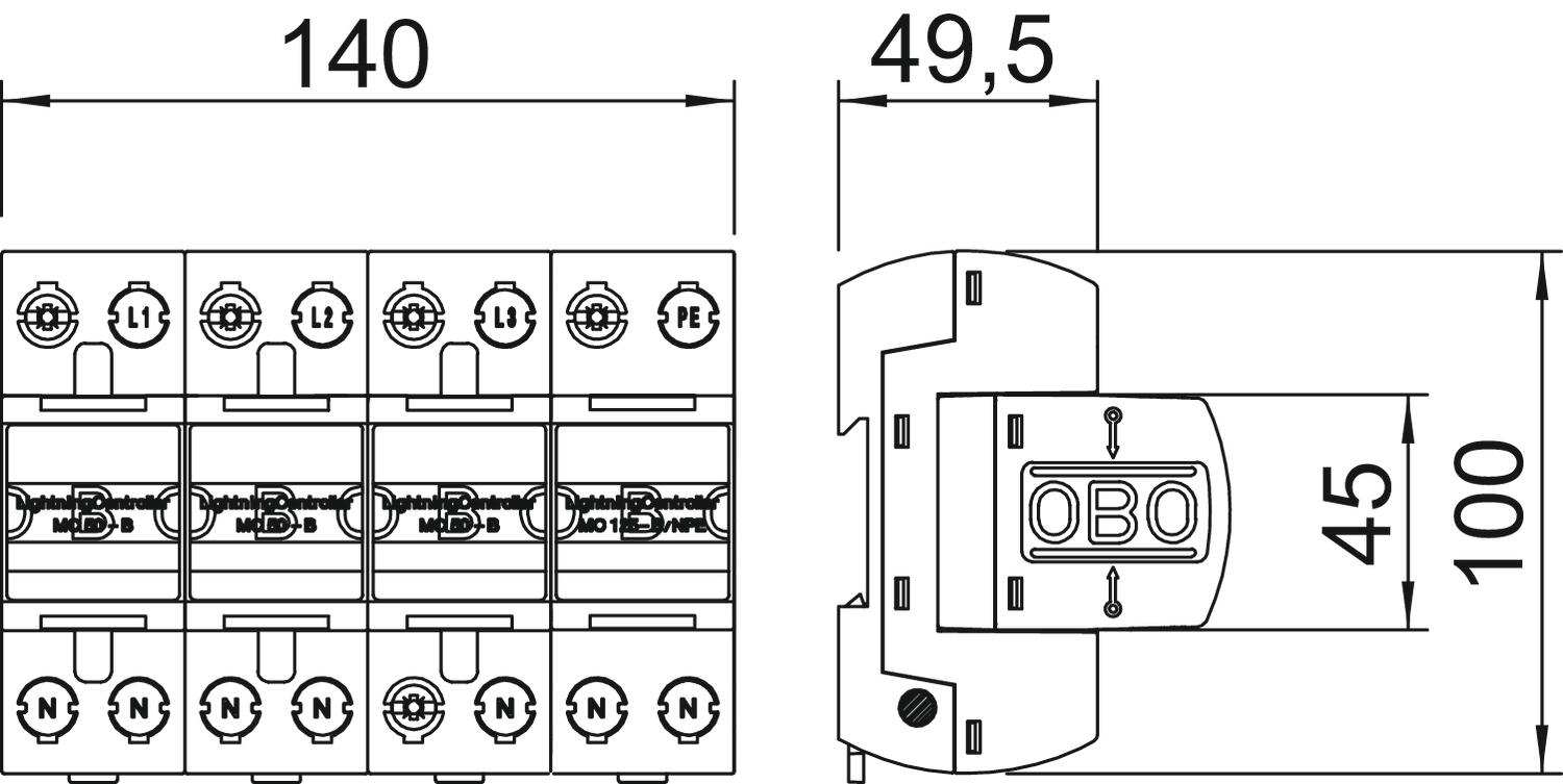 MC 50-B VDE: Lightning arrester, type 1 to EN 61643-11 for interface 0 to 1 (LPZ) according to lightning protection zone concept to IEC 61312-1 and DIN VDE 0185-305.