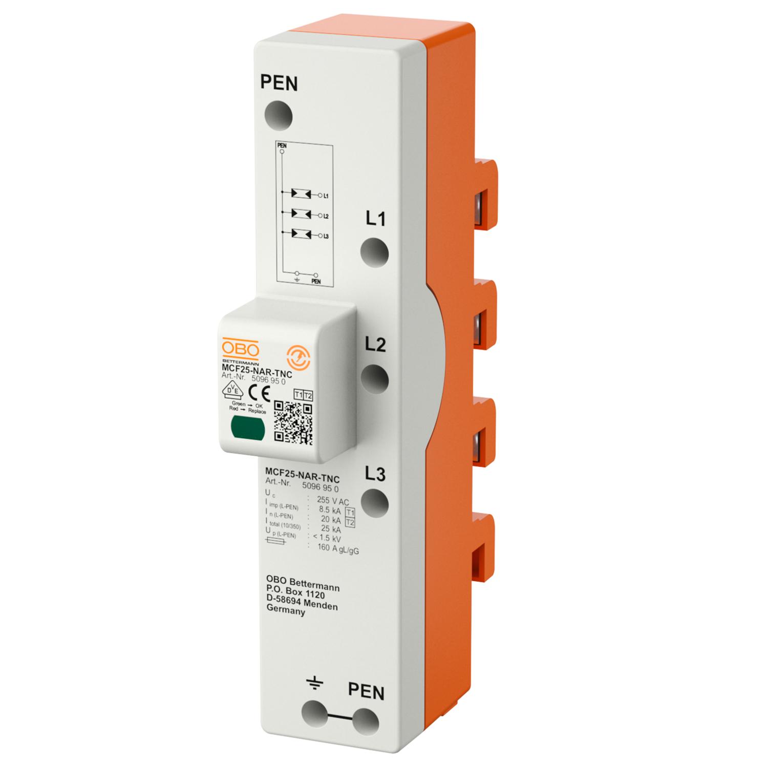 • Lightning current arresting capacity up to 25 kA (10/350) 3-pole