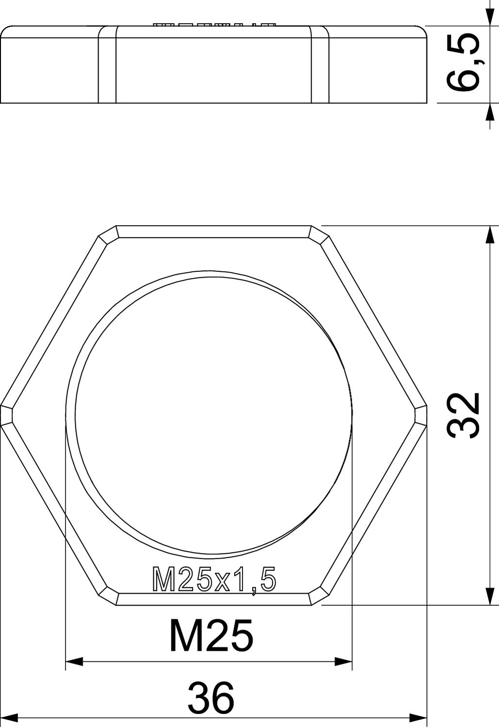 CO2 Footprint (GWP) Cradle-to-Gate 0,0131 kg CO2e / 1 Piece Colour Silver grey; RAL 7001 Dimension M25 Dimension E 36 mm Dimension L 6,5 mm Fibre-glass reinforced no Halogen-free yes Impact-resistant no Material Polyamide Nominal thread size metric/PG 25 Thread M25 x 1,5 Thread type Metric WAF 32 - All types