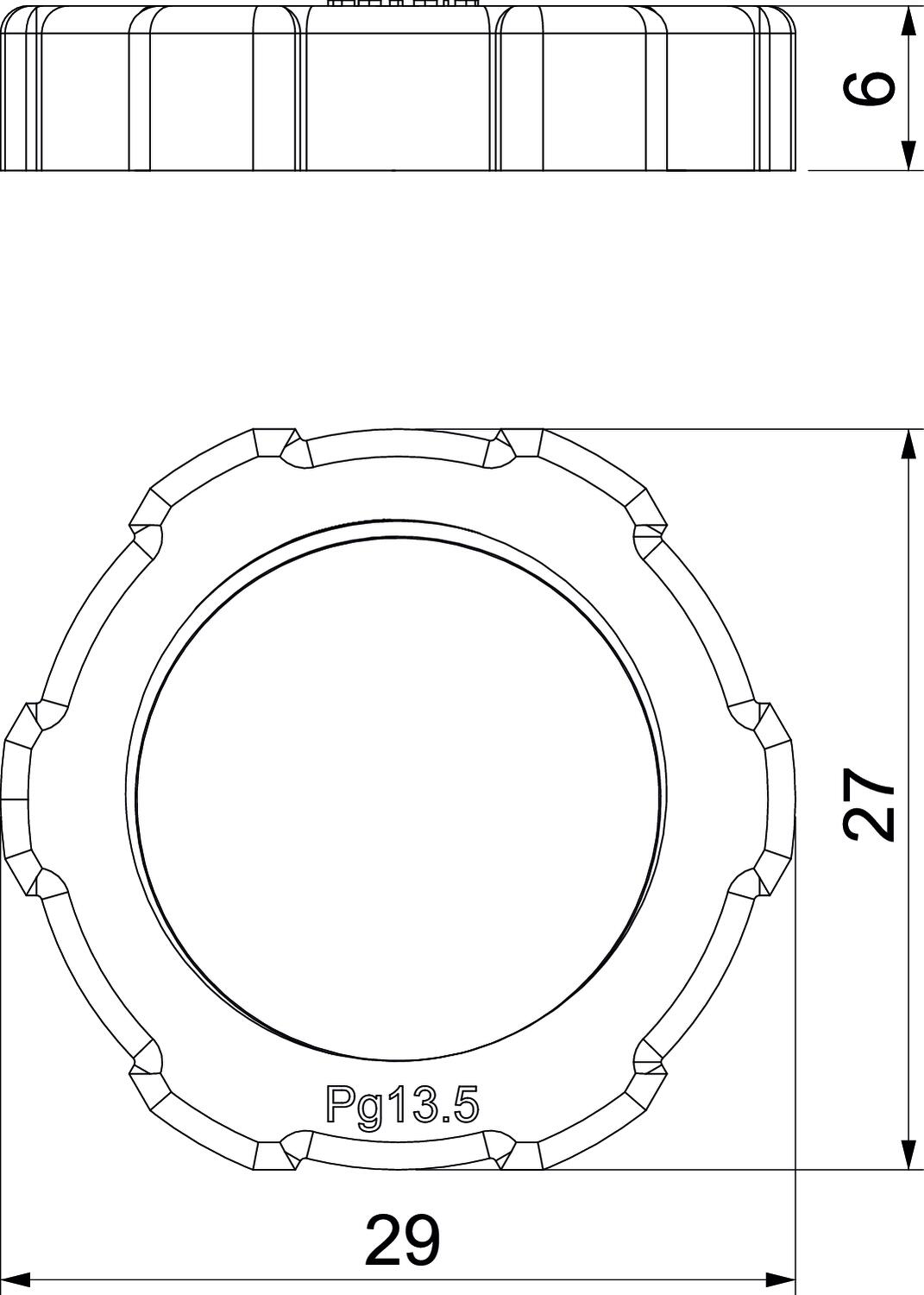 CO2 Footprint (GWP) Cradle-to-Gate 0,012 kg CO2e / 1 Piece Colour Light grey; RAL 7035 Dimension PG13,5 Dimension E 29 mm Dimension L 6 mm Fibre-glass reinforced no Halogen-free yes Impact-resistant no Material Polyamide Nominal thread size metric/PG 13,5 Thread Pg 13,5 Thread type PG WAF 27 - All types