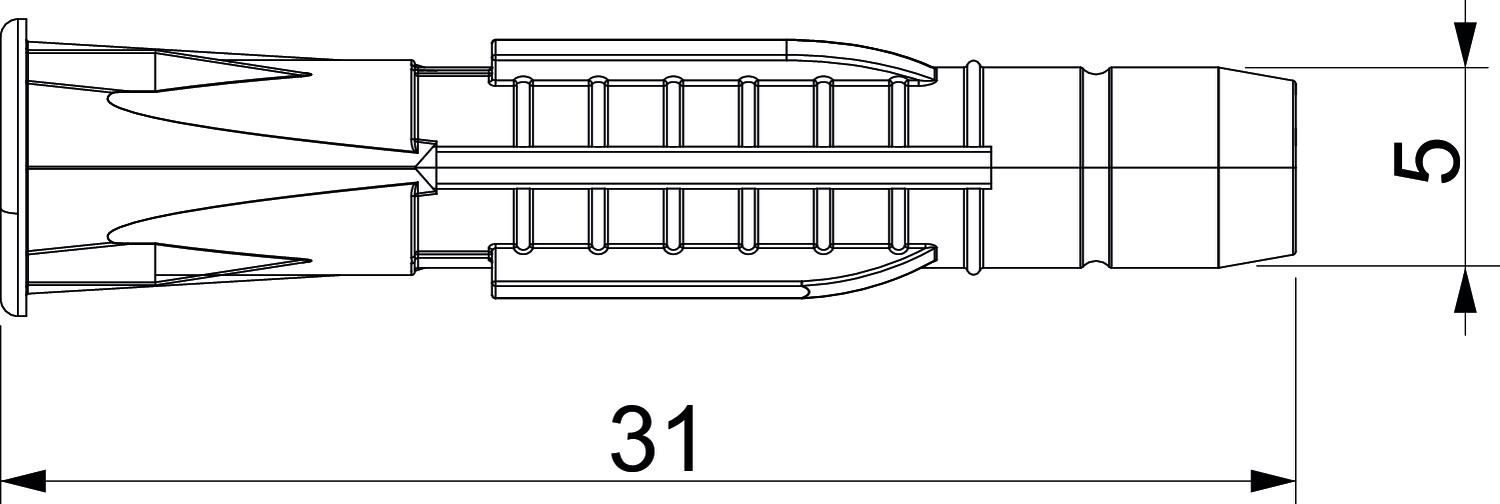 Colour Light grey Diameter 5 mm Dimension 5x31 Dimension D 5 mm Dimension L 31 mm Drill hole diameter, min. 5 mm Length 30 mm Material Polyamide Suitable for fastening with cable ties no Suitable for hexagonal wood screw yes Version for Universal anchor With bolts no Wood screws 3-4 - All types