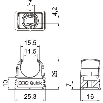Product descriptionFlush-mounted clip to accept metric steel armoured pipes and heavy-duty insulating pipes, as well as Quick-Pipe® electrical installation pipes. Universal fastening options on walls and ceilings, both in indoor and protected outdoor areas. With slot for side alignment during mounting with wood screw or knock-in anchor. Toolless pipe mounting. Can also be arranged with OBO Multi-Quick or proQuick clip. M16 - M32 size can be screwed onto M6 thread. Recommended fastening spacing 50–60 cm, for max. extraction values F at a room temperature of 20 °C, see the table.