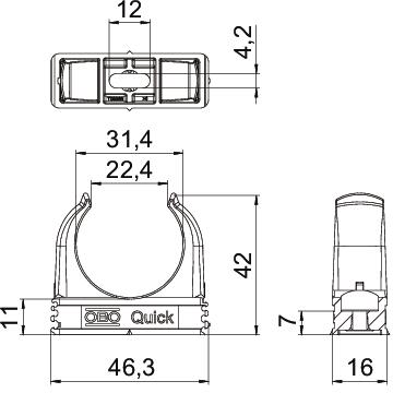 Product descriptionFlush-mounted clip to accept metric steel armoured pipes and heavy-duty insulating pipes, as well as Quick-Pipe® electrical installation pipes. Universal fastening options on walls and ceilings, both in indoor and protected outdoor areas. With slot for side alignment during mounting with wood screw or knock-in anchor. Toolless pipe mounting. Can also be arranged with OBO Multi-Quick or proQuick clip. M16 - M32 size can be screwed onto M6 thread. Recommended fastening spacing 50–60 cm, for max. extraction values F at a room temperature of 20 °C, see the table.