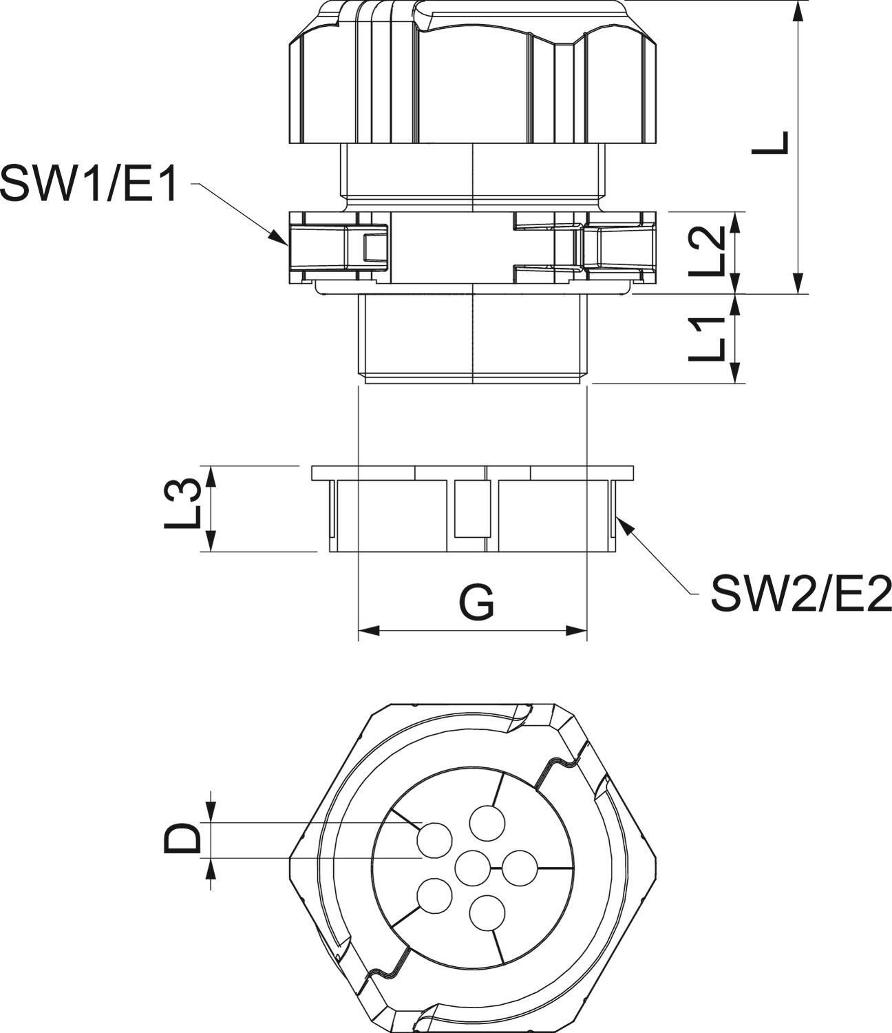 Bend protection no CO2 Footprint (GWP) Cradle-to-Gate 0,3832 kg CO2e / 1 Piece Colour Light grey Dimension M32 Dimension D 11 mm Dimension E1 (mm) 51,5 mm Dimension E2 45 mm Dimension G M32x1,5 mm Dimension L 41 mm Dimension L max. 41 mm Dimension L min. 32 mm Dimension L1 14 mm Dimension L2 10 mm Dimension L3 12 mm explosion-proof no Fibre-glass reinforced no Flame-resistant acc. to VDE 0471/DIN 695 Part 2-1, test temperature 650°C Flat cable gland no For Ex zone Without For Ex zone dust Without For Ex zone gas Without Halogen-free yes Height 53,5 mm Hexagonal corner dimension 45 mm Impact-resistant yes Length 46 mm Material Polycarbonate Nominal thread size 32 Number of drill holes 2 Permitted temperature range, max. 80 °C Permitted temperature range, min. -20 °C Protection rating IP67 Sealing insert, multiple yes Splittable gland yes Strain relief option no Thread M32 x 1,5 Thread increase 1,5 mm Thread length 14 mm Thread type Metric Type of seal Sealing ring Unstable torque 8 Nm Version for Straight WAF 1 46 mm WAF 2 40 mm Width 51,5 mm With locknut yes - All types
