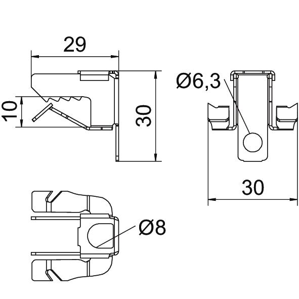 Breaking load 1,2 kN Colour zinc Connection type/component Miscellaneous Dimension 3-8mm Dimension H 30 mm Dimension L 29 mm Dimension W 30 mm Fastening type Clamp Flange thickness F max. 8 mm Flange thickness F min. 3 mm Height 30 mm Hinge, adjustable no Hinged no Length 29 mm Material Steel Surface Zinc slat Width 30 mm - All types