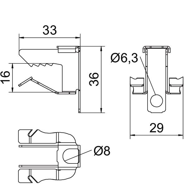 Breaking load 1,2 kN Colour zinc Connection type/component Miscellaneous Dimension 8-14mm Dimension H 36 mm Dimension L 33 mm Dimension W 29 mm Fastening type Clamp Flange thickness F max. 14 mm Flange thickness F min. 8 mm Height 36 mm Hinge, adjustable no Hinged no Length 33 mm Material Steel Surface Zinc slat Width 29 mm - All types