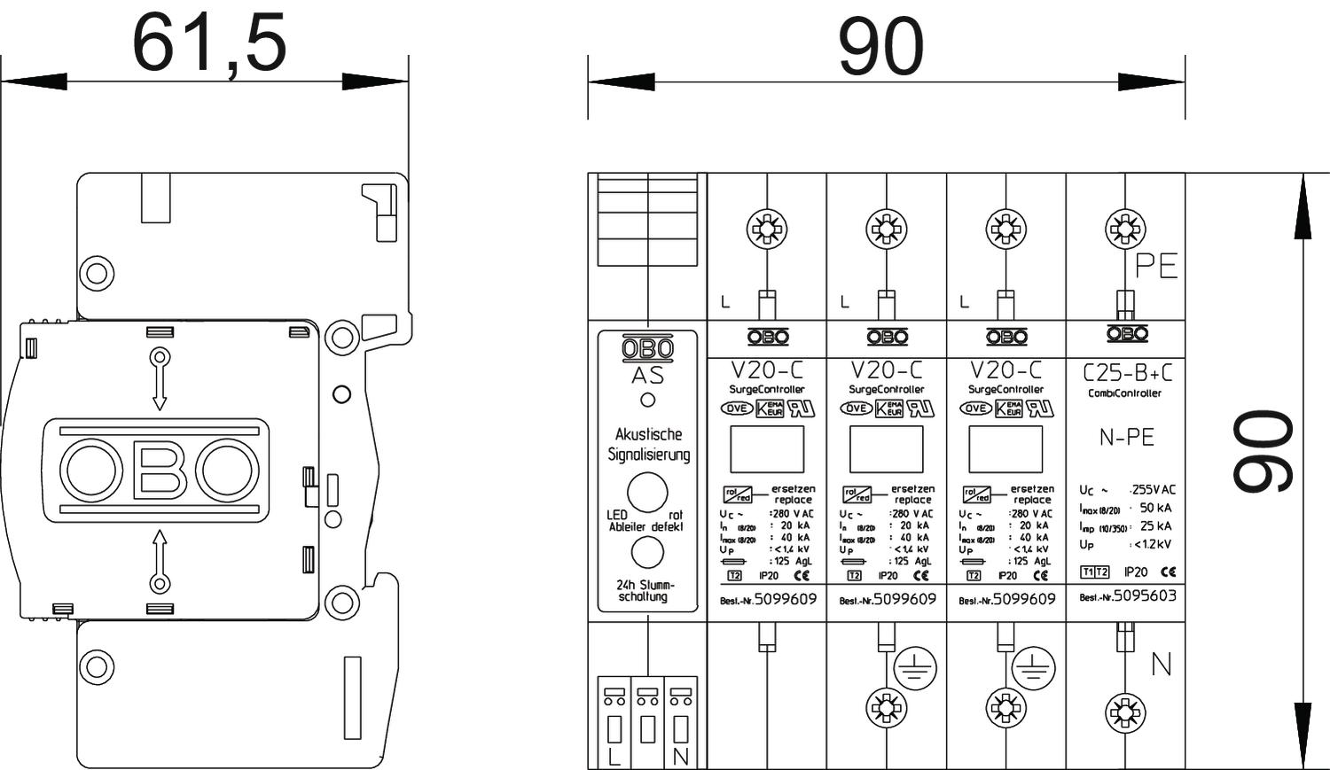 Arrester surge current (8/20 µs) [total] 80 kA Blow-out no CO2 Footprint (GWP) Cradle-to-Gate 2,2308 kg CO2e / 1 Piece Conductor cross-section, rigid (single-wire/multiwire), max. 35 mm² Conductor cross-section, rigid (single-wire/multiwire), min. 2,5 mm² Dimension 280V Installation type DIN rail 35 mm Integrated back-up fuse no Lightning protection zone LPZ 1→2 Max. mains-side overcurrent protection 125 Maximum back-up fuse 125 A Maximum continuous voltage AC 280 V Maximum discharge current (8/20 μs) 40 kA Network form Other Nominal discharge current (8/20 µs) 20 kA Nominal discharge current (8/20 µs) [L-N] 20 kA Nominal voltage AC (50/60 Hz) 230 V Operating temperature, max. 80 °C Operating temperature, min. -40 °C Permitted temperature range, max. 80 °C Permitted temperature range, min. -40 °C Pole version 3+N/PE Protection rating IP20 Remote signalling yes Response time <25 ns Signalling on device Optical and acoustic SPD to EN 61643-11 Type 2 SPD to IEC 61643-1 Class II Test class, type 2 yes TN network form yes TN-C-S network form yes TN-S network form yes TT network form yes Version for 3-pole with NPE; with AS, 280 V - All types