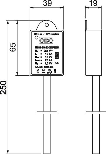 Arrester surge current (8/20 µs) [total] 20 kA CO2 Footprint (GWP) Cradle-to-Gate 0,0394 kg CO2e / 1 Piece Combined voltage protection level [L-PE] 1,6 kV Connecting cable length 0,25 m Dimension 230V Height 19 mm Installation type Miscellaneous Length 250 mm Lightning protection zone LPZ 1→2 Max. mains-side overcurrent protection 16 Maximum back-up fuse 16 A Maximum continuous voltage (L-N) 255 V Maximum continuous voltage (N-PE) 255 V Maximum continuous voltage AC 255 V Maximum discharge current (8/20 μs) 20 kA Maximum discharge current (8/20 μs) [L-N] 10 kA Maximum discharge current (8/20 μs) [N-PE] 10 kA Nominal discharge current (8/20 µs) 10 kA Nominal discharge current (8/20 µs) [L-N] 10 kA Nominal discharge current (8/20 µs) [N-PE] 10 kA Nominal voltage AC (50/60 Hz) 230 V OBO_Nominal load current (input/output terminal) 16 A Operating temperature, max. 80 °C Operating temperature, min. -40 °C Permitted temperature range, max. 80 °C Permitted temperature range, min. -40 °C Pole version 1+N/PE Protection level [L-N] ≤1,5 Protection rating IP65 Response time <25 ns Signalling on device Visual SPD to EN 61643-11 Type 2+3 SPD to IEC 61643-1 Class II+III Test class, type 2 yes Test class, type 3 yes Version for 1-pole + NPE for PC I Width 40 mm - All types