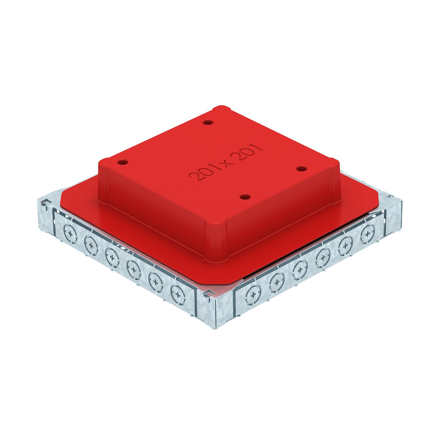 Product descriptionUnderfloor outlet box with fixed, unchangeable 201 x 201 mm installation opening for an installation unit of nominal size 4. The mounting opening is created using the screed protection cover contained in the scope of supply. The underfloor box possesses installation openings for a 2 or 3-compartment sheet steel underfloor duct of nominal size 25038 as well as six M20 or M25 installation pipes on all four sides. The box is principally suited for use in floor structures in cement screed with a structure height of up to 90 mm.