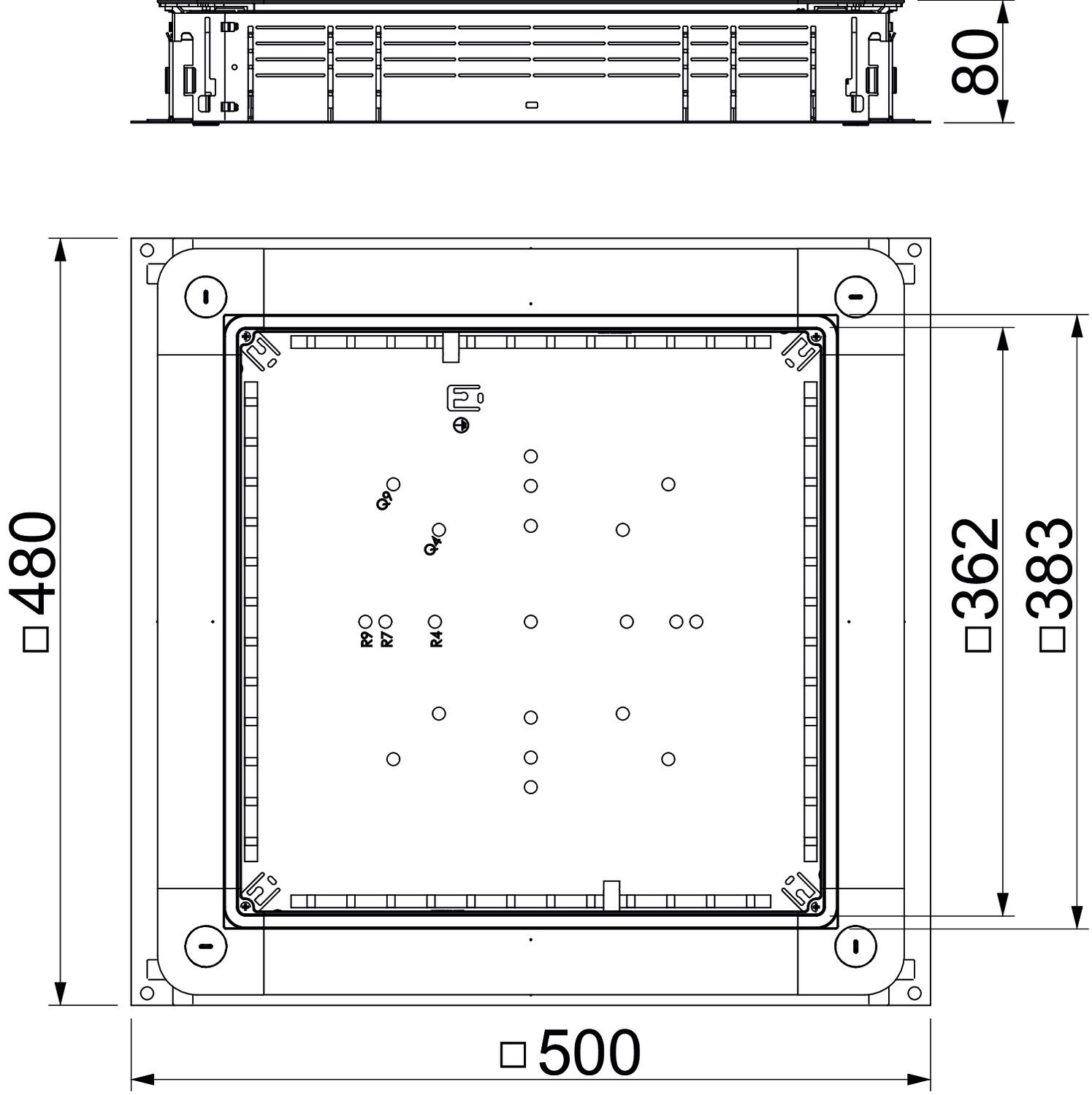 Cover version Universal Decouplable yes Dimension 500x480x80 Dimension A 480 mm Dimension a 362 mm Dimension B 500 mm Dimension b 383 mm Duct height, min. 28 mm Floor plate yes For pipe connection no Height-adjustment range, max. 160 mm Height-adjustment range, min. 115 mm Installation opening for flush-mount unit Square Installation opening for on-floor tank no Material Steel Minimum screed height 115 Nominal size 350 mm Number of installable devices 1 Protection rating (IP) when used IP20 Screed height, max. 160 mm Screed height, min. 115 mm Seal installation option yes Suitable for screed-covered underfloor ducts yes Suitable for screed-flush closed underfloor ducts no Suitable for underfloor ducts yes Surface Strip galvanized Trunking height, max. 58 mm Trunking width, max. 350 mm Trunking width, min. 190 mm - All types